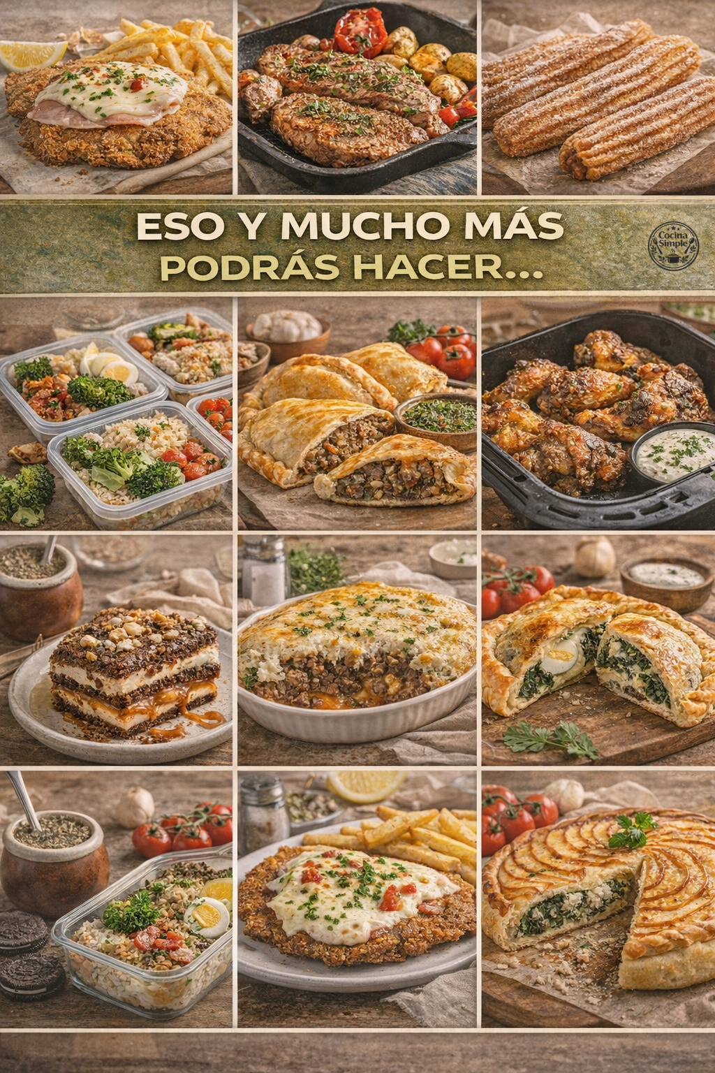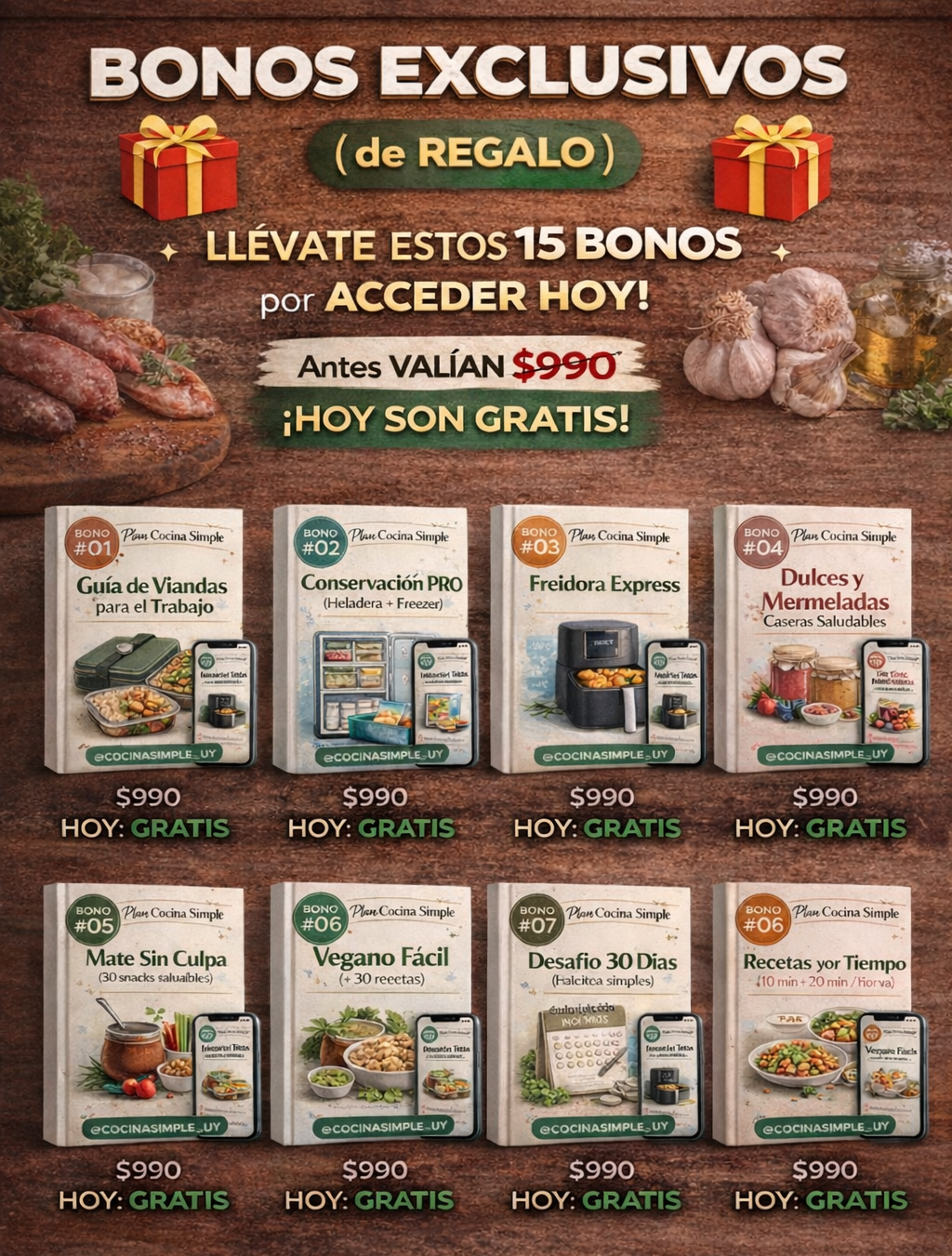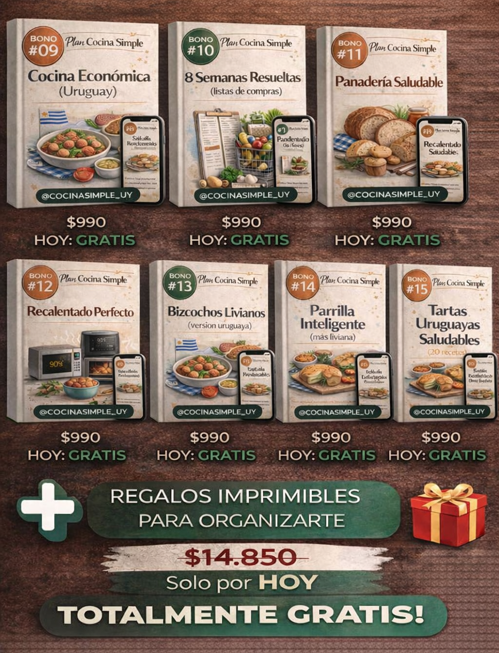 Recibís el ebook principal Plan Cocina Simple + 15 bonos digitales de regalo (recetas, organización, listas, airfryer, viandas, tartas, parrilla liviana y más). Es un pack súper completo para que tengas la semana resuelta.